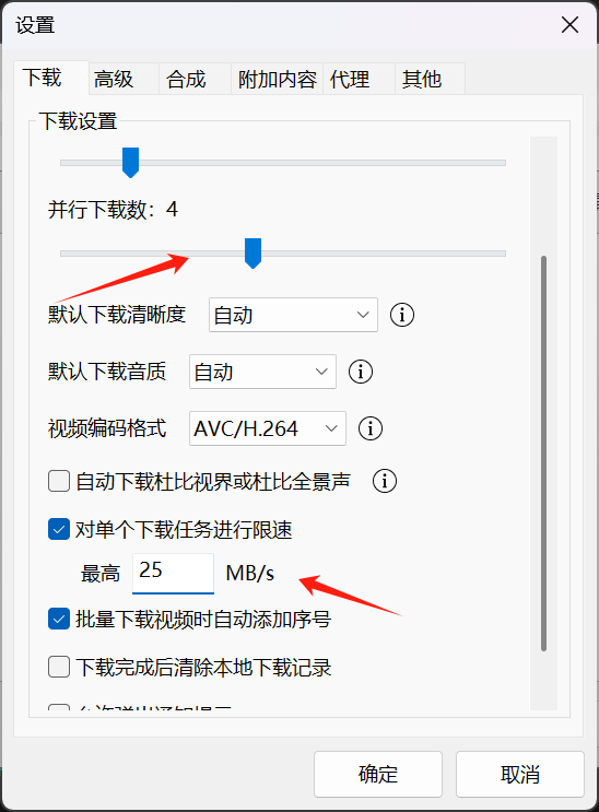 在下载窗口或设置窗口中将并行下载数调高,同时开启单个视频限速功能,设置具体的限速值,可避免下载速度分配不均的问题,提升批量下载的体验。